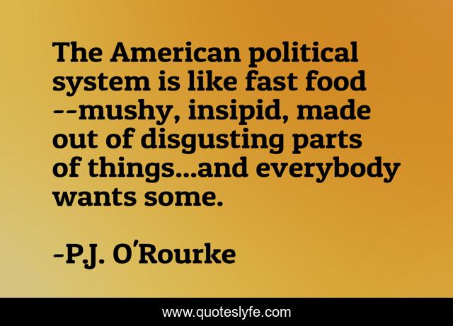 This page presents the quote "The American political system is like fast food--mushy, insipid, made out of disgusting parts of things...and everybody wants some.". Author of this quote is P.J. O'Rourke. This quote is about politics, america,.