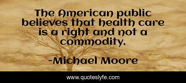 This page presents the quote "The American public believes that health care is a right and not a commodity.". Author of this quote is Michael Moore. This quote is about american, right, care,.