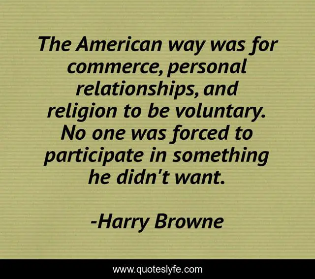 This page presents the quote "The American way was for commerce, personal relationships, and religion to be voluntary. No one was forced to participate in something he didn't want.". Author of this quote is Harry Browne. This quote is about relationships, american,.