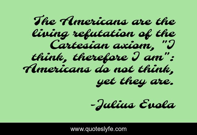 This page presents the quote "The Americans are the living refutation of the Cartesian axiom, "I think, therefore I am": Americans do not think, yet they are.". Author of this quote is Julius Evola. This quote is about america, democracy,.