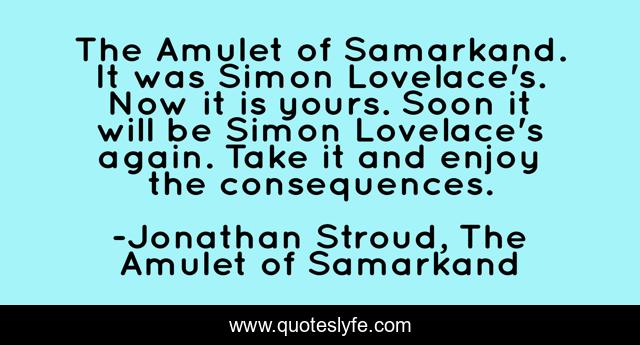 This page presents the quote "The Amulet of Samarkand. It was Simon Lovelace's. Now it is yours. Soon it will be Simon Lovelace's again. Take it and enjoy the consequences.". Author of this quote is Jonathan Stroud, The Amulet of Samarkand. This quote is about jonathan-stroud, humor, consequences, sarcasm, bartimaeus, simon-lovelace, amulets,.
