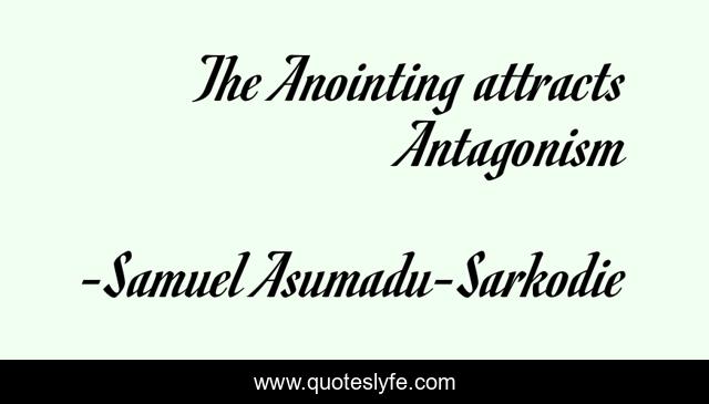 This page presents the quote "The Anointing attracts Antagonism". Author of this quote is Samuel Asumadu-Sarkodie. This quote is about proverbs, words-of-knowledge, discernment, parables, words-of-wisdom, inspirational-life,.