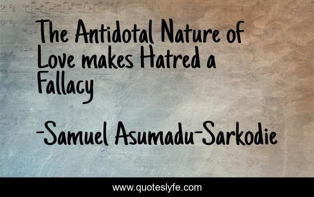 This page presents the quote "The Antidotal Nature of Love makes Hatred a Fallacy". Author of this quote is Samuel Asumadu-Sarkodie. This quote is about proverbs, words-of-knowledge, discernment, parables, words-of-wisdom, inspiration,.