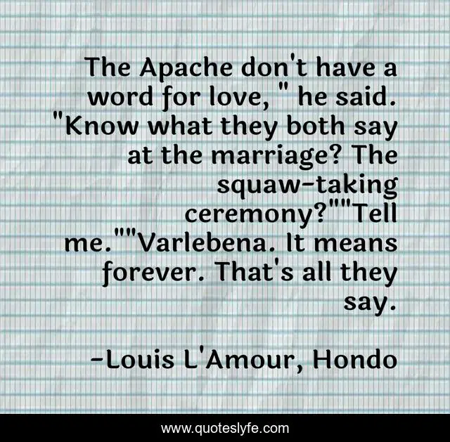 This page presents the quote "The Apache don't have a word for love, " he said. "Know what they both say at the marriage? The squaw-taking ceremony?""Tell me.""Varlebena. It means forever. That's all they say.". Author of this quote is Louis L'Amour, Hondo. This quote is about marriage, poetry,.