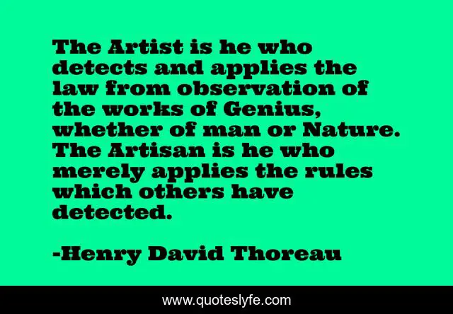 This page presents the quote "The Artist is he who detects and applies the law from observation of the works of Genius, whether of man or Nature. The Artisan is he who merely applies the rules which others have detected.". Author of this quote is Henry David Thoreau. This quote is about law, man, artist,.