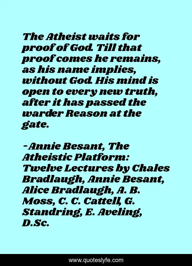 "Annie Besant, The Atheistic Platform: Twelve Lectures by Chales Bradlaugh, Annie Besant, Alice Bradlaugh, A. B. Moss, C. C. Cattell, G. Standring, E. Aveling, D.Sc. Quotes." Quoteslyfe.com, 2025. Mon. 08 Dec. 2025. <https://www.quoteslyfe.com/quote/The-Atheist-waits-for-proof-of-God-175823>.