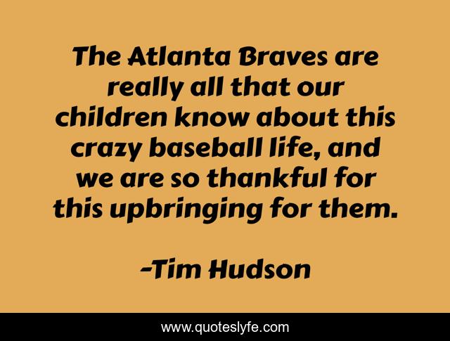 This page presents the quote "The Atlanta Braves are really all that our children know about this crazy baseball life, and we are so thankful for this upbringing for them.". Author of this quote is Tim Hudson. This quote is about life, baseball, children,.