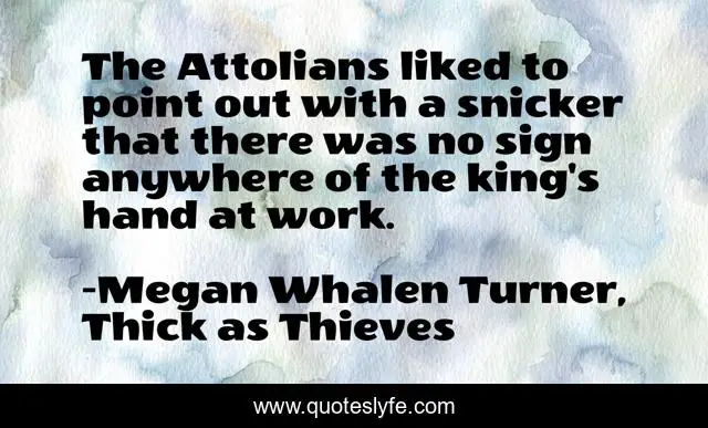 This page presents the quote "The Attolians liked to point out with a snicker that there was no sign anywhere of the king's hand at work.". Author of this quote is Megan Whalen Turner, Thick as Thieves. .