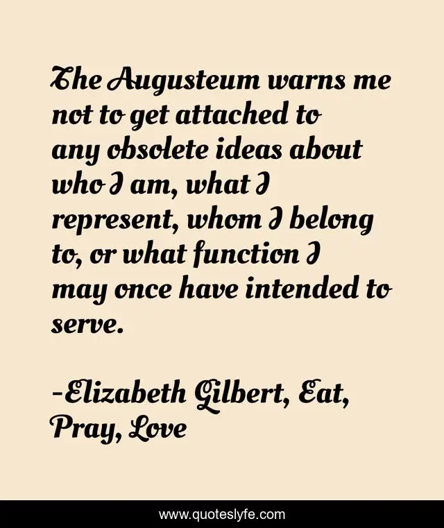 This page presents the quote "The Augusteum warns me not to get attached to any obsolete ideas about who I am, what I represent, whom I belong to, or what function I may once have intended to serve.". Author of this quote is Elizabeth Gilbert, Eat, Pray, Love. This quote is about transformation, identity,.