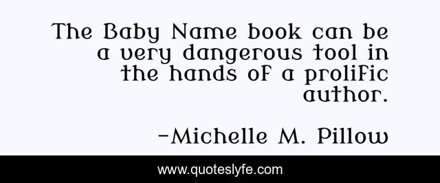 This page presents the quote "The Baby Name book can be a very dangerous tool in the hands of a prolific author.". Author of this quote is Michelle M. Pillow. This quote is about writing-life, prolific, author-life, naming-characters, dangerous, world-building, prolific-authors,.