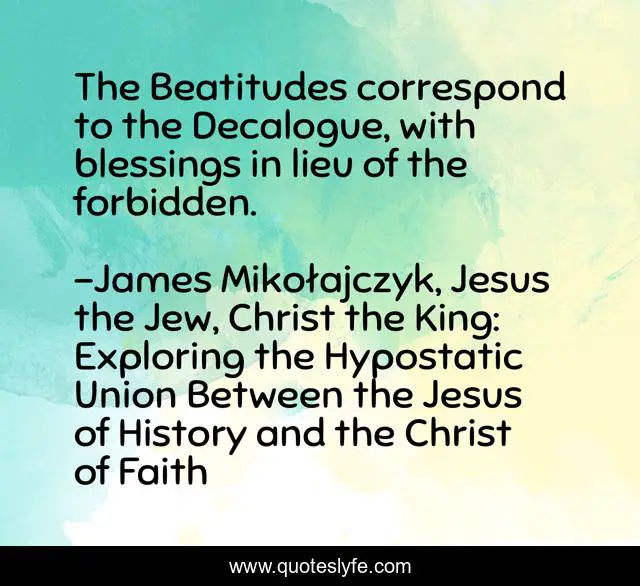 "James Mikołajczyk, Jesus the Jew, Christ the King: Exploring the Hypostatic Union Between the Jesus of History and the Christ of Faith Quotes." Quoteslyfe.com, 2025. Fri. 05 Dec. 2025. <https://www.quoteslyfe.com/quote/The-Beatitudes-correspond-to-the-Decalogue-with-240861>.
