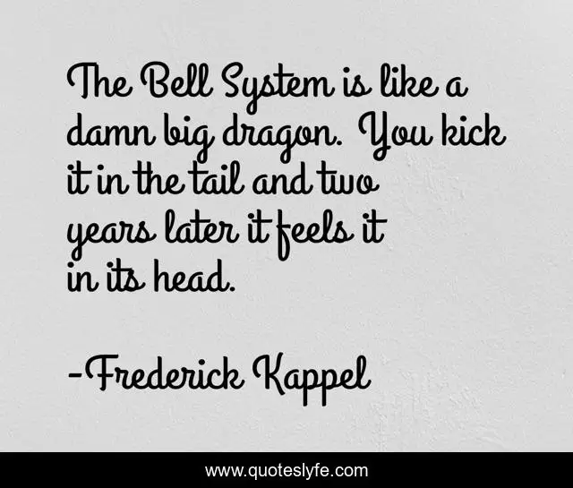 This page presents the quote "The Bell System is like a damn big dragon. You kick it in the tail and two years later it feels it in its head.". Author of this quote is Frederick Kappel. .