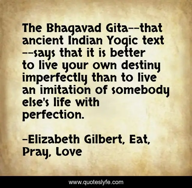 This page presents the quote "The Bhagavad Gita--that ancient Indian Yogic text--says that it is better to live your own destiny imperfectly than to live an imitation of somebody else's life with perfection.". Author of this quote is Elizabeth Gilbert, Eat, Pray, Love. .