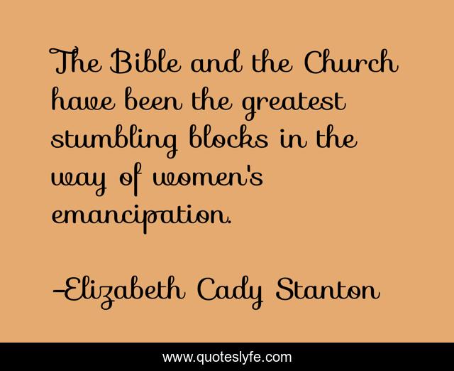 This page presents the quote "The Bible and the Church have been the greatest stumbling blocks in the way of women's emancipation.". Author of this quote is Elizabeth Cady Stanton. This quote is about bible, greatest, church,.
