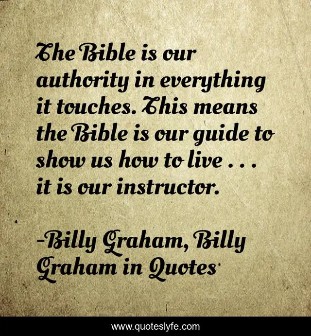 This page presents the quote "The Bible is our authority in everything it touches. This means the Bible is our guide to show us how to live . . . it is our instructor.". Author of this quote is Billy Graham, Billy Graham in Quotes. This quote is about bible, billy-graham,.