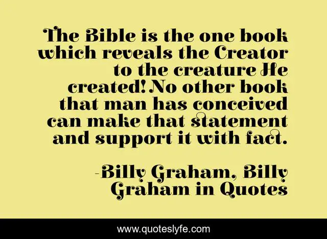 This page presents the quote "The Bible is the one book which reveals the Creator to the creature He created! No other book that man has conceived can make that statement and support it with fact.". Author of this quote is Billy Graham, Billy Graham in Quotes. This quote is about bible, creation, billy-graham,.