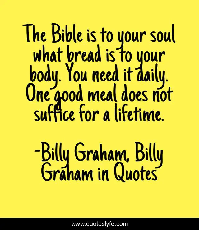 This page presents the quote "The Bible is to your soul what bread is to your body. You need it daily. One good meal does not suffice for a lifetime.". Author of this quote is Billy Graham, Billy Graham in Quotes. This quote is about bible, billy-graham,.