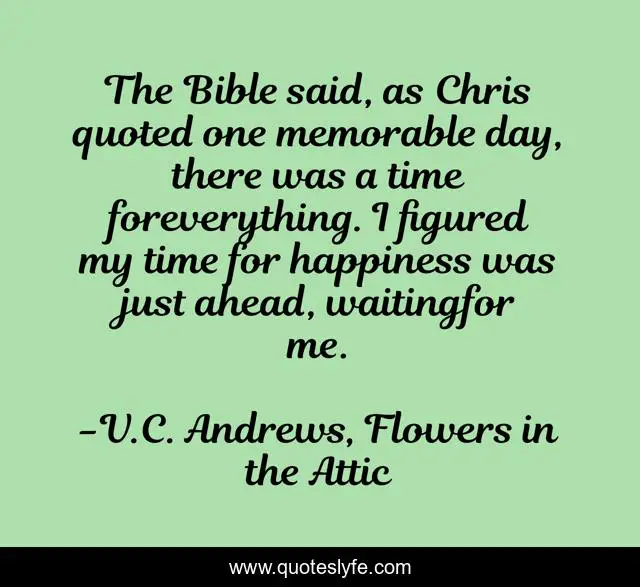 This page presents the quote "The Bible said, as Chris quoted one memorable day, there was a time foreverything. I figured my time for happiness was just ahead, waitingfor me.". Author of this quote is V.C. Andrews, Flowers in the Attic. This quote is about waiting, bible, happiness, time,.