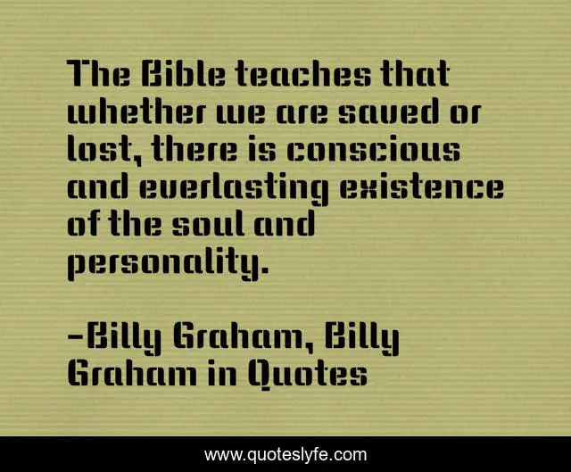 This page presents the quote "The Bible teaches that whether we are saved or lost, there is conscious and everlasting existence of the soul and personality.". Author of this quote is Billy Graham, Billy Graham in Quotes. This quote is about billy-graham, the-soul,.