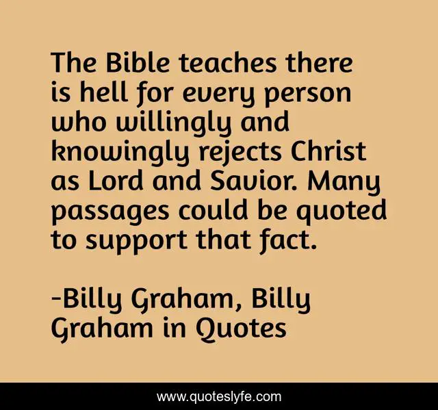 This page presents the quote "The Bible teaches there is hell for every person who willingly and knowingly rejects Christ as Lord and Savior. Many passages could be quoted to support that fact.". Author of this quote is Billy Graham, Billy Graham in Quotes. This quote is about hell, billy-graham,.
