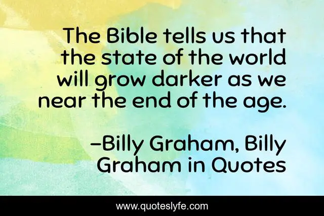 This page presents the quote "The Bible tells us that the state of the world will grow darker as we near the end of the age.". Author of this quote is Billy Graham, Billy Graham in Quotes. This quote is about bible, state-of-the-world, end-of-the-age, end-times, billy-graham,.