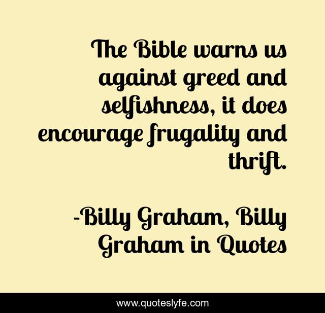 This page presents the quote "The Bible warns us against greed and selfishness, it does encourage frugality and thrift.". Author of this quote is Billy Graham, Billy Graham in Quotes. This quote is about greed, billy-graham,.