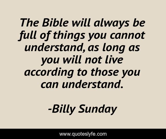 This page presents the quote "The Bible will always be full of things you cannot understand, as long as you will not live according to those you can understand.". Author of this quote is Billy Sunday. This quote is about application, bible, understanding,.