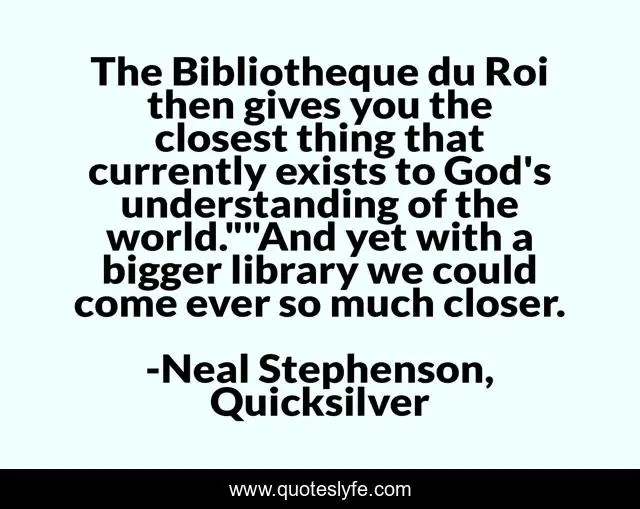 This page presents the quote "The Bibliotheque du Roi then gives you the closest thing that currently exists to God's understanding of the world.""And yet with a bigger library we could come ever so much closer.". Author of this quote is Neal Stephenson, Quicksilver. .