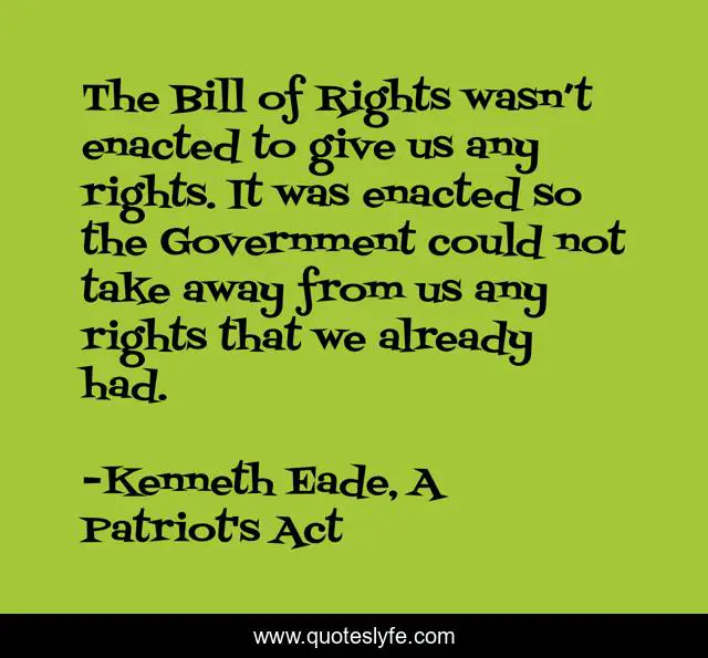 This page presents the quote "The Bill of Rights wasn’t enacted to give us any rights. It was enacted so the Government could not take away from us any rights that we already had.". Author of this quote is Kenneth Eade, A Patriot's Act. This quote is about constitutional-rights, bill-of-rights, constitution, government,.