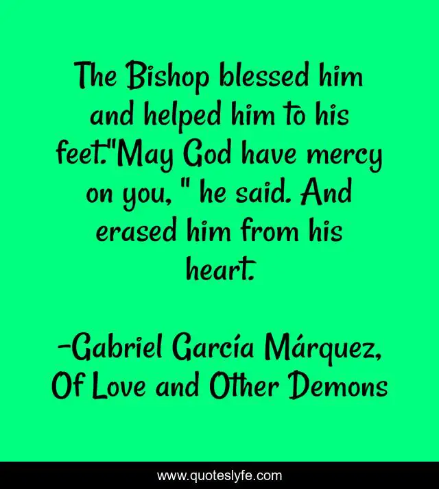 This page presents the quote "The Bishop blessed him and helped him to his feet."May God have mercy on you, " he said. And erased him from his heart.". Author of this quote is Gabriel García Márquez, Of Love and Other Demons. This quote is about literary, forgiveness,.