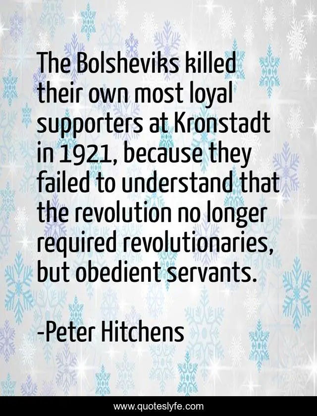 This page presents the quote "The Bolsheviks killed their own most loyal supporters at Kronstadt in 1921, because they failed to understand that the revolution no longer required revolutionaries, but obedient servants.". Author of this quote is Peter Hitchens. This quote is about revolutions, bolsheviks, god, revolutionaries, atheism, religion, servants,.
