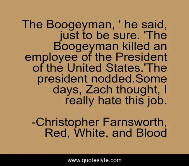 This page presents the quote "The Boogeyman, ' he said, just to be sure. 'The Boogeyman killed an employee of the President of the United States.'The president nodded.Some days, Zach thought, I really hate this job.". Author of this quote is Christopher Farnsworth, Red, White, and Blood. This quote is about boogeyman, humor, vampires, paranormal-suspense,.