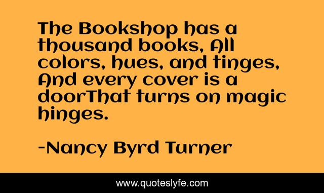This page presents the quote "The Bookshop has a thousand books, All colors, hues, and tinges, And every cover is a doorThat turns on magic hinges.". Author of this quote is Nancy Byrd Turner. This quote is about books, bookstores,.