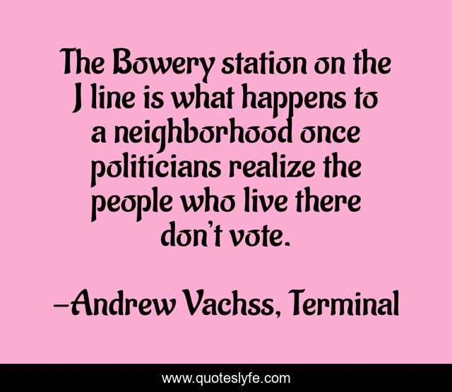 This page presents the quote "The Bowery station on the J line is what happens to a neighborhood once politicians realize the people who live there don’t vote.". Author of this quote is Andrew Vachss, Terminal. This quote is about vote, politicians, voting,.