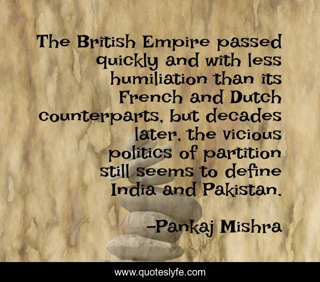 This page presents the quote "The British Empire passed quickly and with less humiliation than its French and Dutch counterparts, but decades later, the vicious politics of partition still seems to define India and Pakistan.". Author of this quote is Pankaj Mishra. This quote is about empire, india, british,.