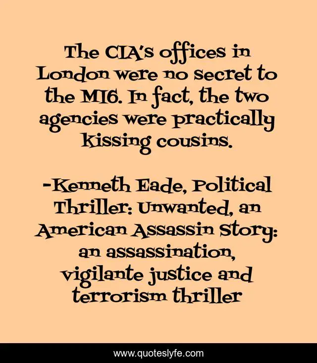 This page presents the quote "The CIA’s offices in London were no secret to the MI6. In fact, the two agencies were practically kissing cousins.". Author of this quote is Kenneth Eade, Political Thriller: Unwanted, an American Assassin Story: an assassination, vigilante justice and terrorism thriller. This quote is about intelligence, cia, intellgence-community, espionage, mi6,.