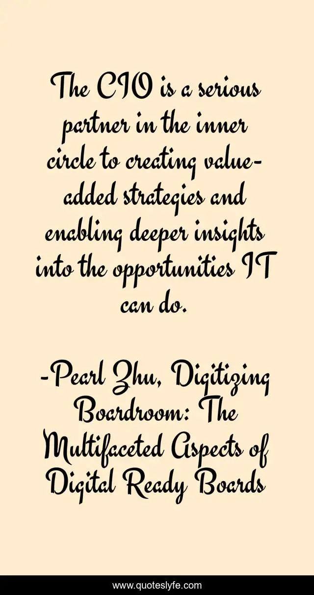 This page presents the quote "The CIO is a serious partner in the inner circle to creating value-added strategies and enabling deeper insights into the opportunities IT can do.". Author of this quote is Pearl Zhu, Digitizing Boardroom: The Multifaceted Aspects of Digital Ready Boards. This quote is about it, boards, strategy,.