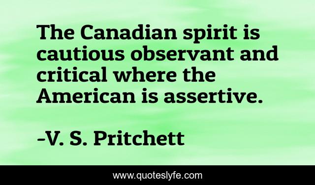 This page presents the quote "The Canadian spirit is cautious observant and critical where the American is assertive.". Author of this quote is V. S. Pritchett. This quote is about canada, canadians,.