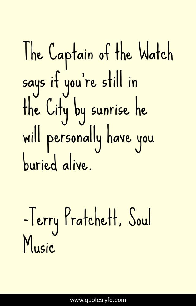 This page presents the quote "The Captain of the Watch says if you're still in the City by sunrise he will personally have you buried alive.". Author of this quote is Terry Pratchett, Soul Music. .