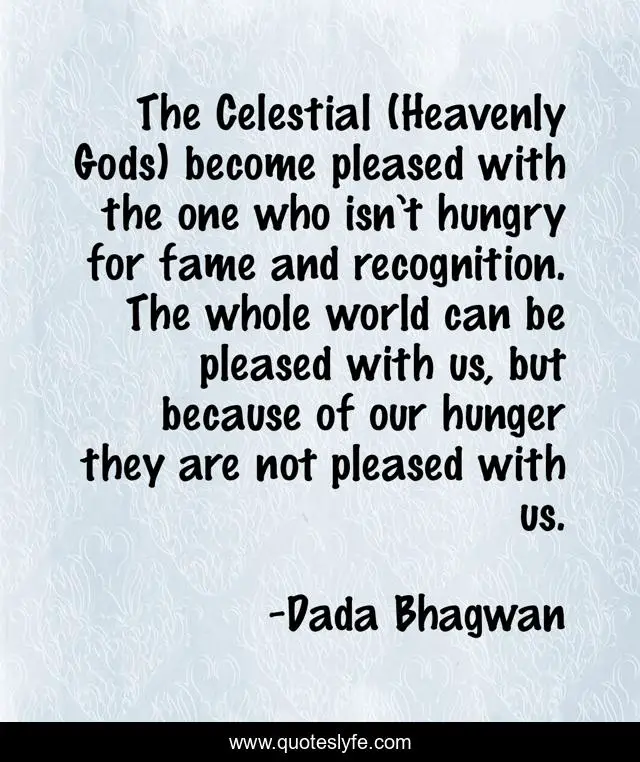 This page presents the quote "The Celestial (Heavenly Gods) become pleased with the one who isn’t hungry for fame and recognition. The whole world can be pleased with us, but because of our hunger they are not pleased with us.". Author of this quote is Dada Bhagwan. This quote is about god, spiritual,.