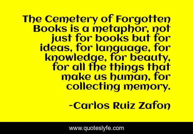 This page presents the quote "The Cemetery of Forgotten Books is a metaphor, not just for books but for ideas, for language, for knowledge, for beauty, for all the things that make us human, for collecting memory.". Author of this quote is Carlos Ruiz Zafon. This quote is about beauty, language, memory,.