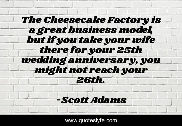 This page presents the quote "The Cheesecake Factory is a great business model, but if you take your wife there for your 25th wedding anniversary, you might not reach your 26th.". Author of this quote is Scott Adams. This quote is about food, humor, marriage,.