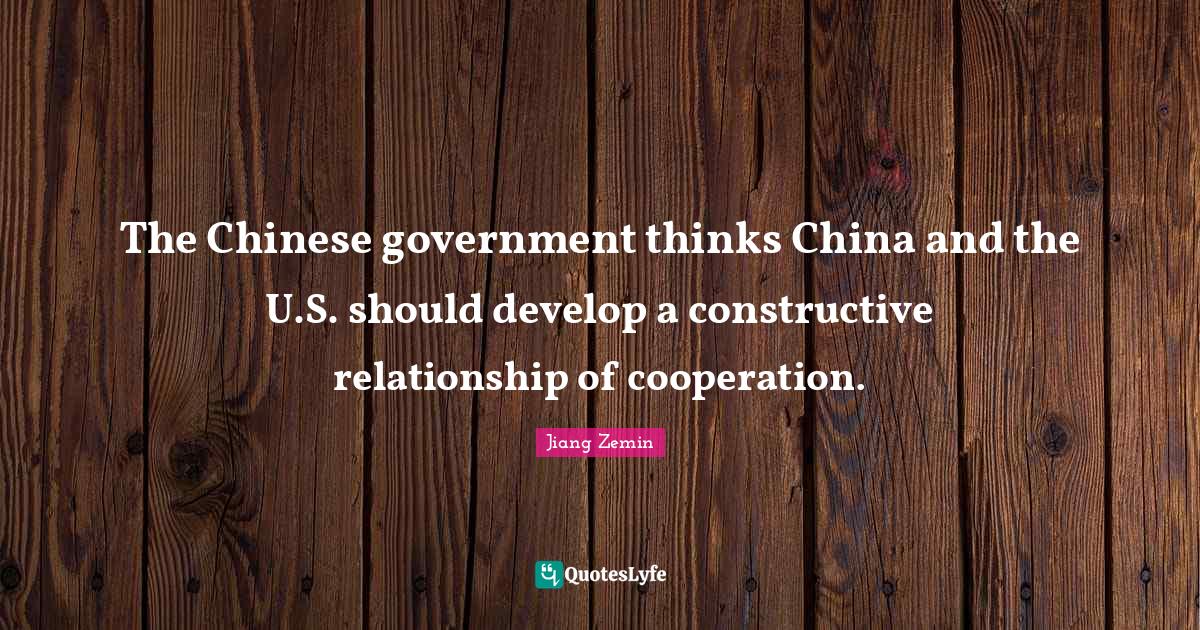 This page presents the quote "The Chinese government thinks China and the U.S. should develop a constructive relationship of cooperation.". Author of this quote is Jiang Zemin. This quote is about government, constructive, china, chinese, relationship, thinking, cooperation,.