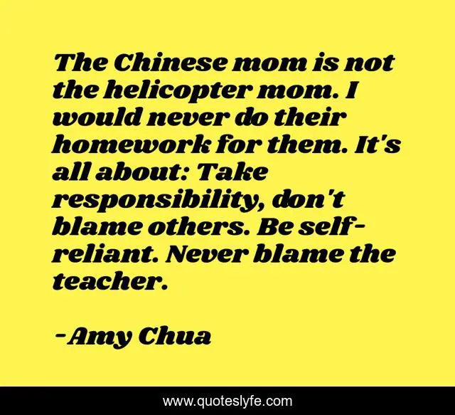This page presents the quote "The Chinese mom is not the helicopter mom. I would never do their homework for them. It's all about: Take responsibility, don't blame others. Be self-reliant. Never blame the teacher.". Author of this quote is Amy Chua. This quote is about blame, responsibility, mom,.