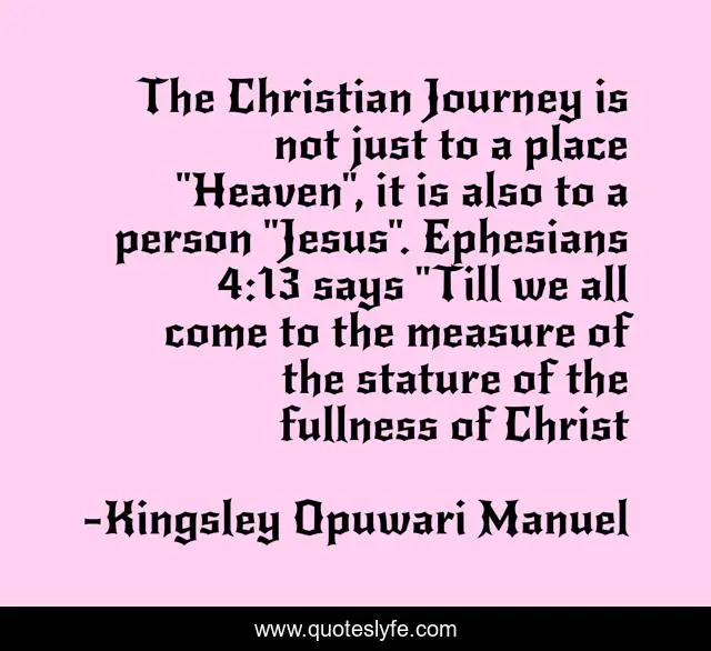 This page presents the quote "The Christian Journey is not just to a place "Heaven", it is also to a person "Jesus". Ephesians 4:13 says "Till we all come to the measure of the stature of the fullness of Christ". Author of this quote is Kingsley Opuwari Manuel. This quote is about faith-based, spiritual, heaven, christian, destiny, glory, god, christian-journey, character,.