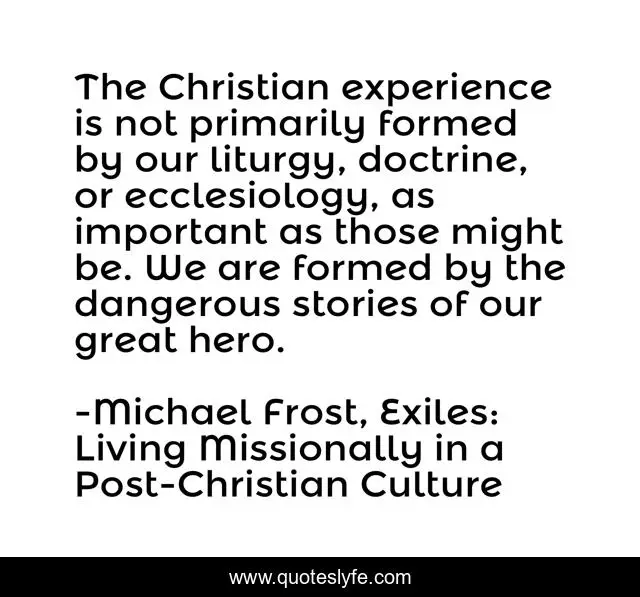 This page presents the quote "The Christian experience is not primarily formed by our liturgy, doctrine, or ecclesiology, as important as those might be. We are formed by the dangerous stories of our great hero.". Author of this quote is Michael Frost, Exiles: Living Missionally in a Post-Christian Culture. This quote is about christian-experience, michael-frost, jesus, formation, doctrine, ecclesiology,.