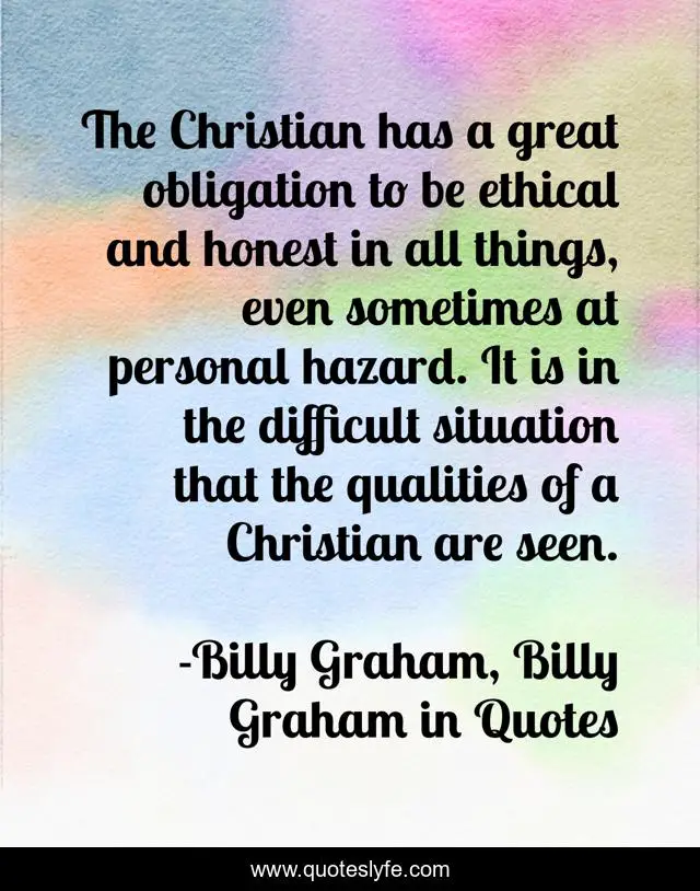 This page presents the quote "The Christian has a great obligation to be ethical and honest in all things, even sometimes at personal hazard. It is in the difficult situation that the qualities of a Christian are seen.". Author of this quote is Billy Graham, Billy Graham in Quotes. This quote is about billy-graham, christianity,.