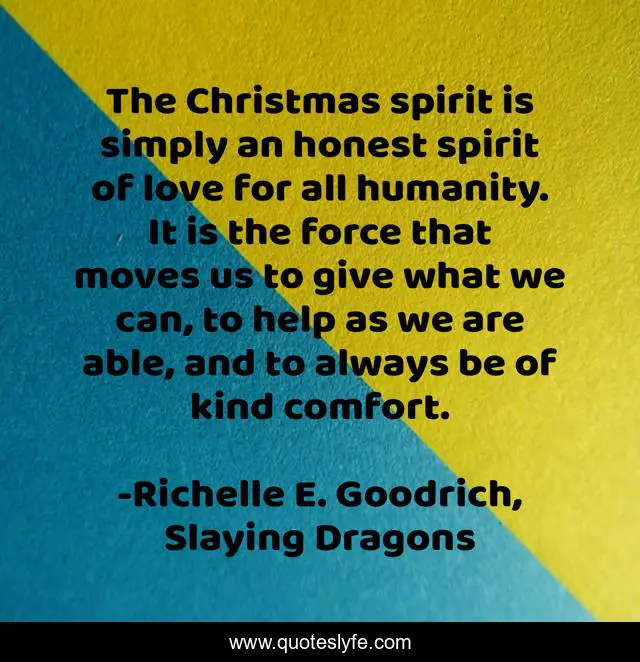 This page presents the quote "The Christmas spirit is simply an honest spirit of love for all humanity. It is the force that moves us to give what we can, to help as we are able, and to always be of kind comfort.". Author of this quote is Richelle E. Goodrich, Slaying Dragons. This quote is about christmas-spirit, love, richelle-e-goodrich, comfort, richelle, loving-others, richelle-goodrich, kindness, christmas,.