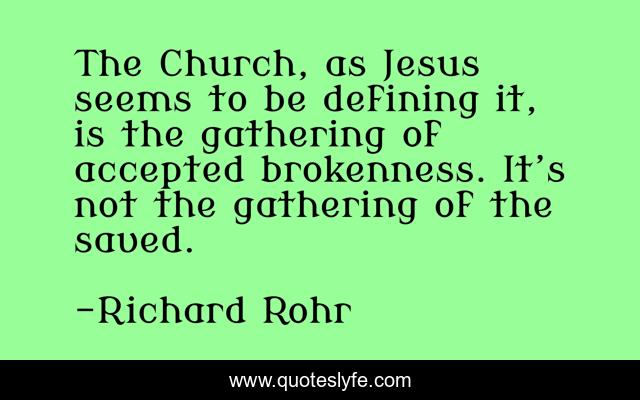 This page presents the quote "The Church, as Jesus seems to be defining it, is the gathering of accepted brokenness. It’s not the gathering of the saved.". Author of this quote is Richard Rohr. This quote is about richard-rohr, brokenness, church,.