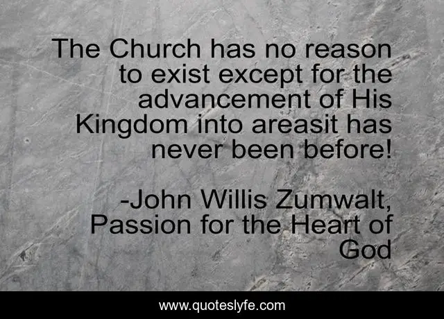This page presents the quote "The Church has no reason to exist except for the advancement of His Kingdom into areasit has never been before!". Author of this quote is John Willis Zumwalt, Passion for the Heart of God. This quote is about kingdom-of-god, missionary, church,.